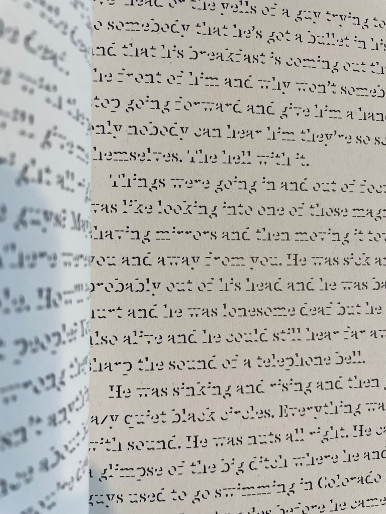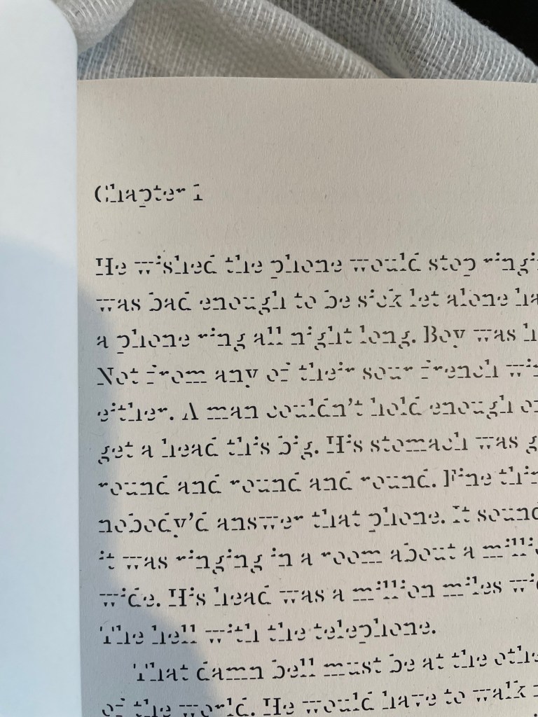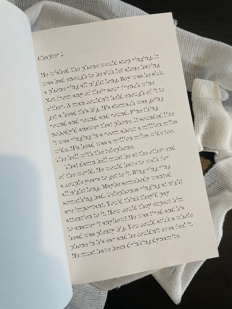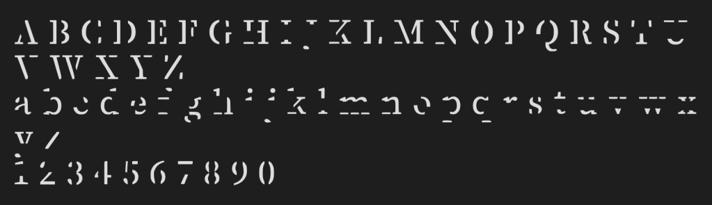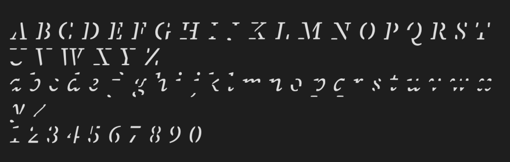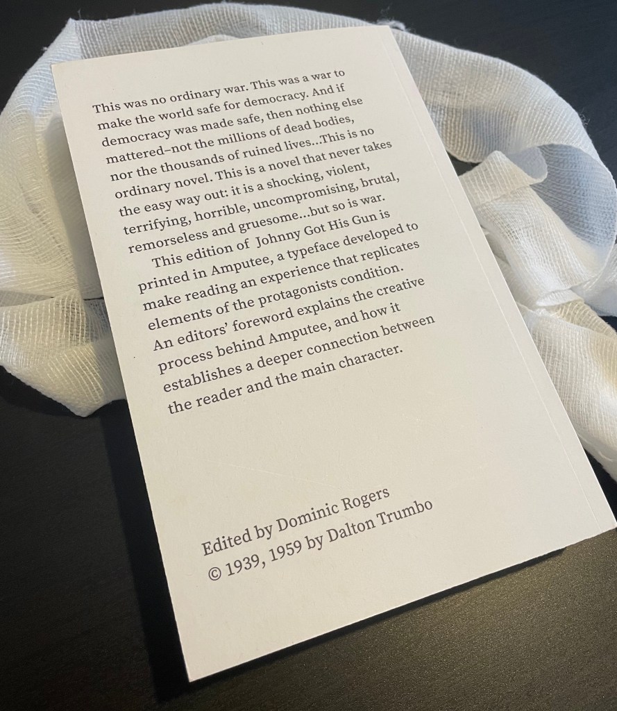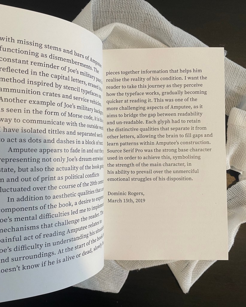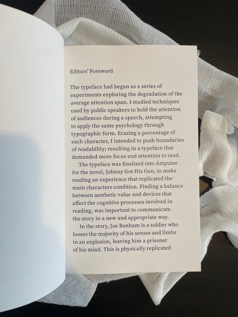 I created the typeface Amputee to portray with elements of the story, bringing the reader closer to Johnny’s physical and mental condition. The missing limbs of letters are an abstraction of his own missing limbs, the painful act of reading relates to his struggle to understand his current situation. Gradually as the reader learns to read the typeface they get quicker, mimicking Johnny as he figures out his surroundings and physical state. Mentally Johnny goes through many stages in the book, he concurs these out of strength. Figuratively the typeface replicates these stages with a strong base character of Source Serif Pro allowing legibility despite parts of the glyph being erased. Through the book Johnny’s militarily past haunts him, this is seen in the capital characters of Amputee. They are purposefully erased in a similar form to stencil typefaces he saw on ammo crates and tanks. Overall the typeface was cut to leave as many dots and dashes as possible, this in tern makes it look like morse code; a pivotal form of communication for the military and later in the story.