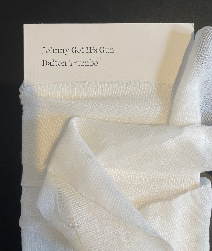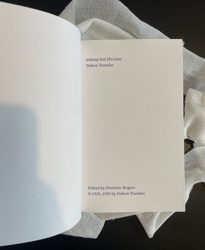 The black and white choice is because Johnny is now blind and very much in a world without colour. Page numbers don’t exist because dates or the passing of time don’t to Johnny and the book is wrapped in a bandage as he is after the explosion that took place.