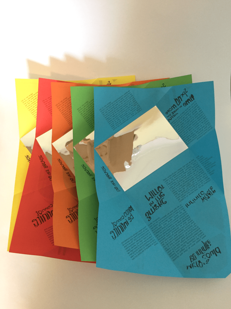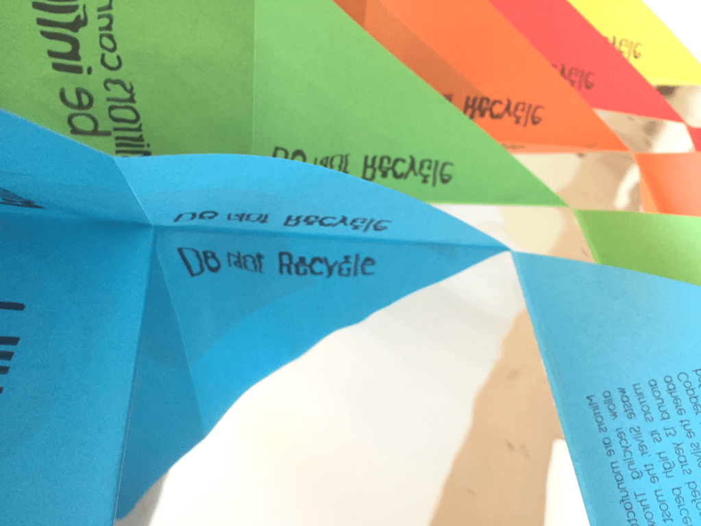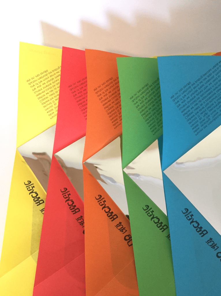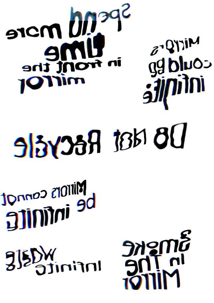This project aimed to highlight items that are difficult to recycle, specifically mirrors. I used this opportunity to explore various negative aspects of mirrors, including the time we spend in front of them, and included this information in the infographic leaflet. The main focus was on the cradle-to-grave cycle. Reflections became a central conceptual element of the project, with the leaflet featuring backwards text that needed to be reflected on a panel to be read.