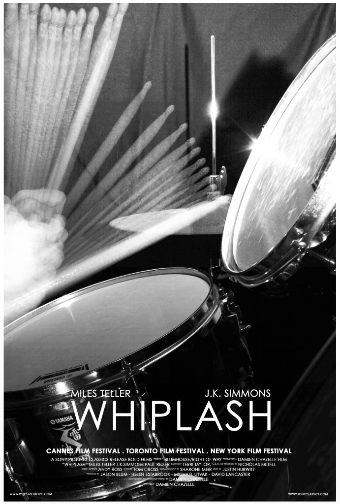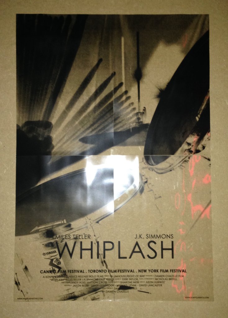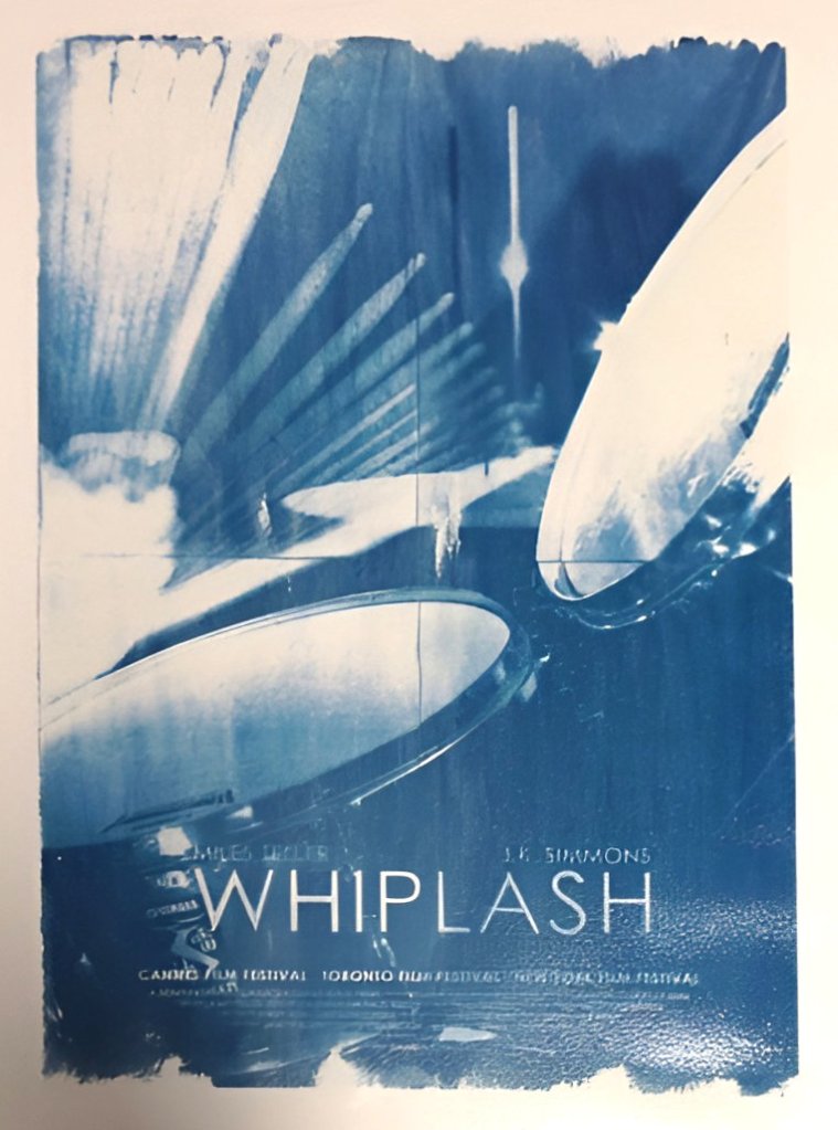 For this visual, I wanted to translate the theme of repetition and the main protagonist’s obsessive determination. These elements become the central focus of his life, and this is reflected in the poster by making the drums and sticks the main focus. Additionally, the use of stroboscopic flash captures the movement of the drumsticks in a single photo, conveying the dramatic and energetic playing style of jazz. I chose to create a large format (A2) cyanotype for the final version. The blue tones of the cyanotype reference the historic appearance of Blue Note Records album covers, which are synonymous with jazz music. Furthermore, the raw, brushed edges give the otherwise clean, atheistic design a rough and distressed appearance, which further connects with the film’s concepts.