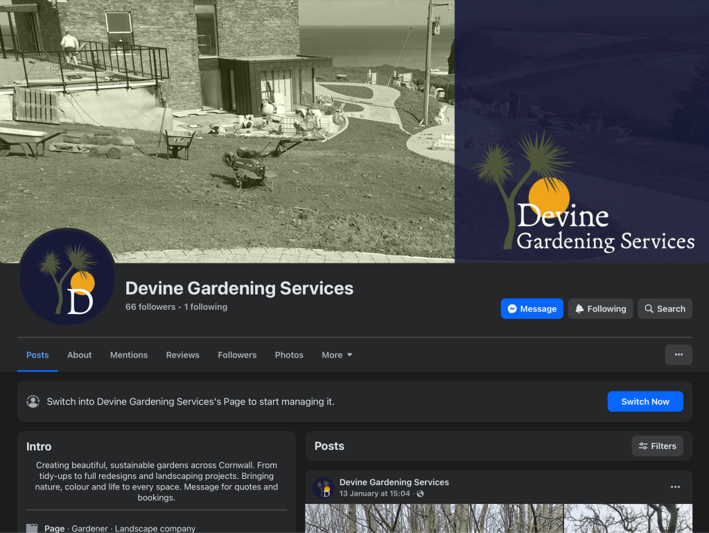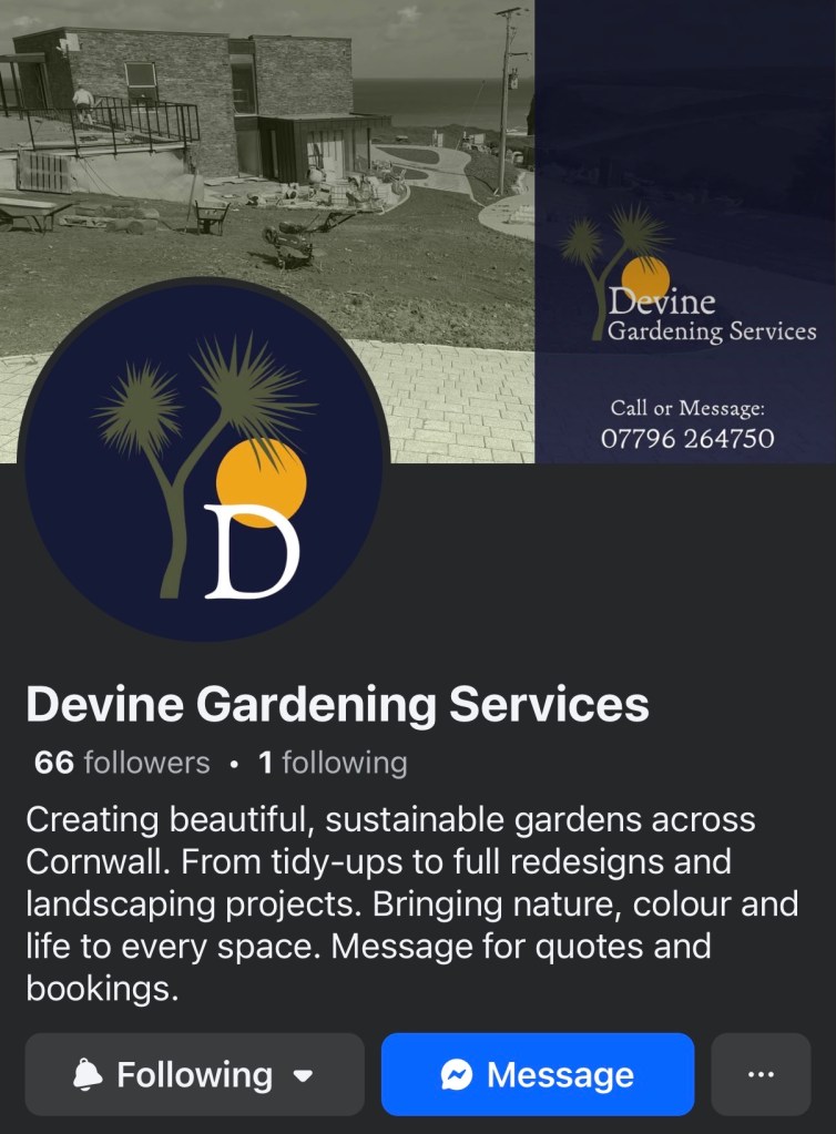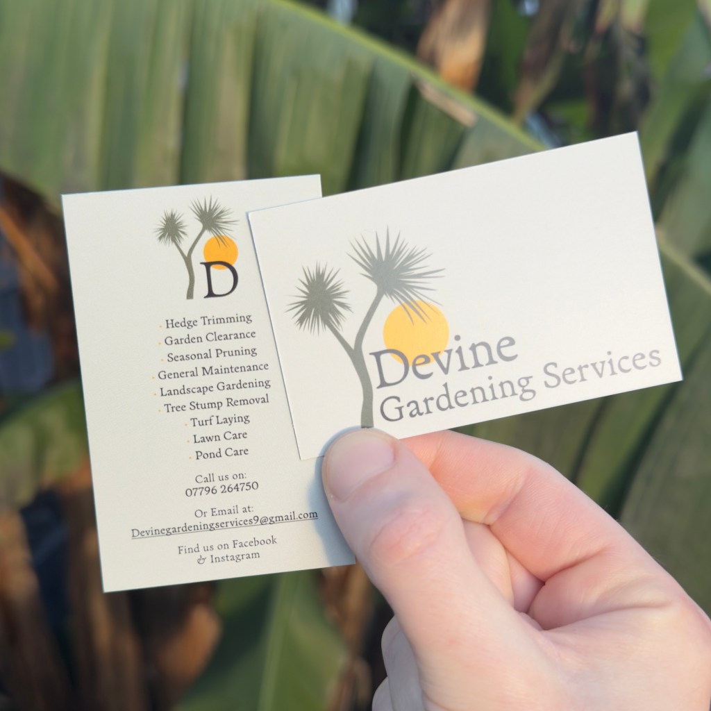 Over the past several years, I have led the branding for Devine Gardening Services, a Cornwall-based gardening business. This included designing the logo and visual identity and applying it consistently across online platforms, uniforms, vehicles, and printed materials such as leaflets and business cards. I also manage the company’s social media presence, creating a professional and approachable space where people can discover and engage with the business’s work.
